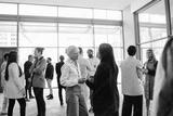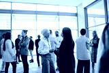 Diverse professionals networking at a business event in a modern office building
