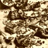 Grilled lamb ribs with pomegranate seeds, fresh mint and rosemary in metal baking tray. Meat barbecue and slow food concept. Selective focus, square crop
