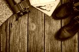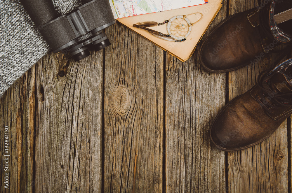 Accessories for travel top view on wooden background with copy space. Adventure and wanderlust concept image with travel accessories. Preparing for an exotic trip, journey and sightseeing.