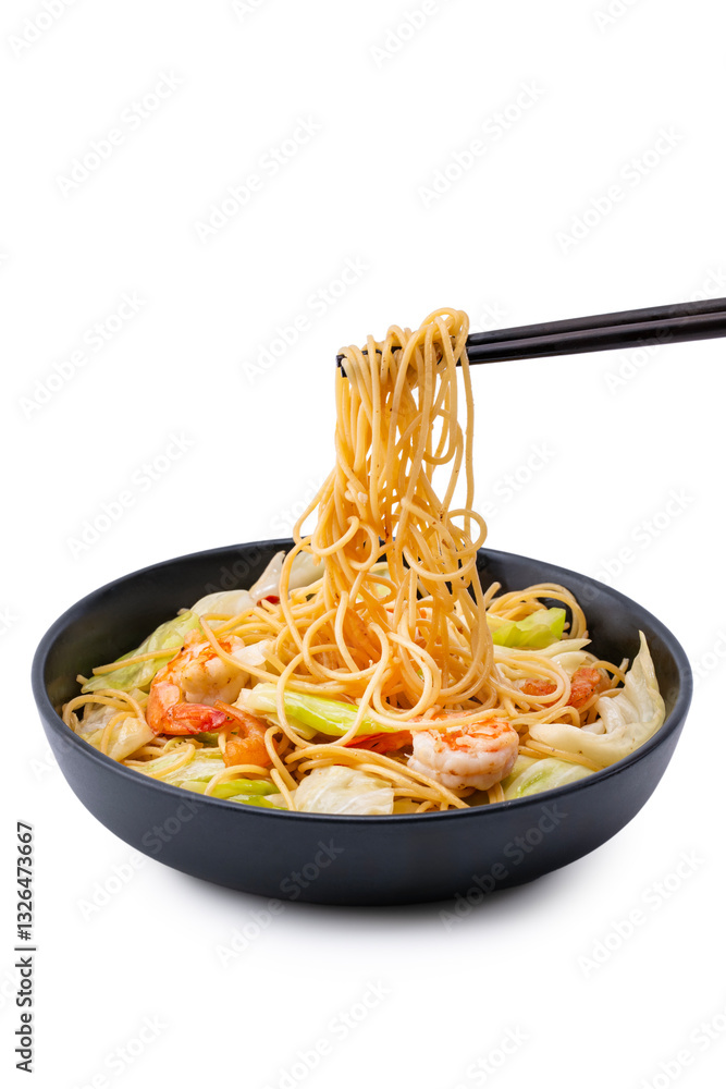 Stir-fried noodles with shrimp and vegetables on a black plate, Asian style food.
