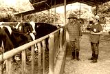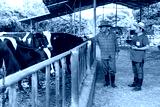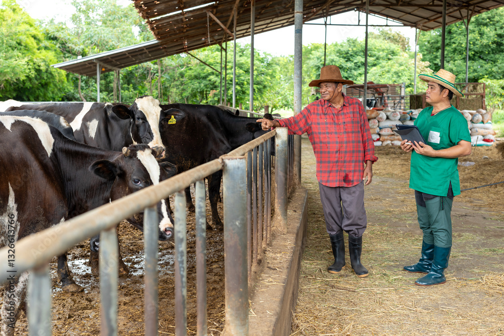 Senior farmer and male veterinarian using tablet computer to check health of dairy cows on farm, Livestock care