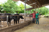 Male veterinarians and senior farmers work in livestock care and research on livestock farms, small livestock industries in Asian.