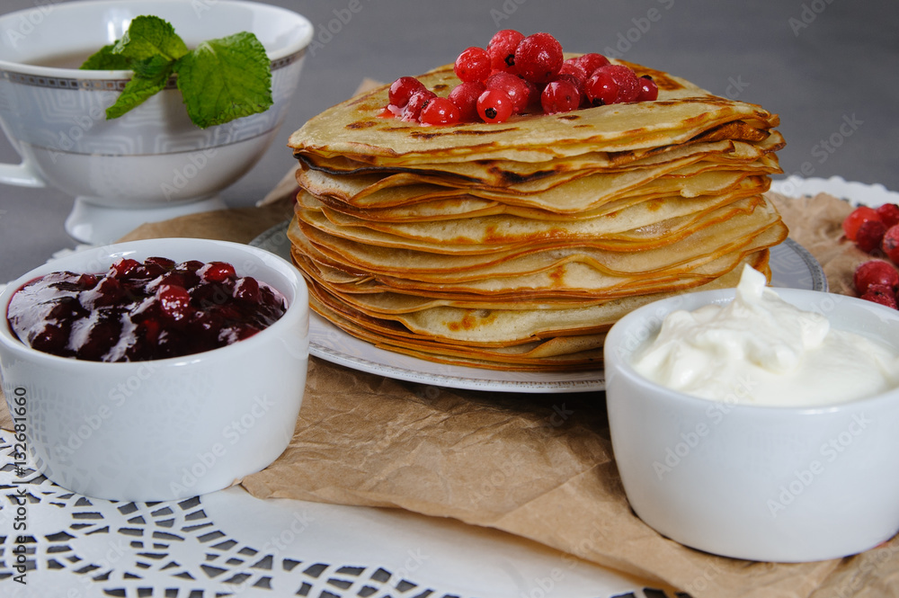 Pancakes served with sour cream, fresh cranberries and cranberry