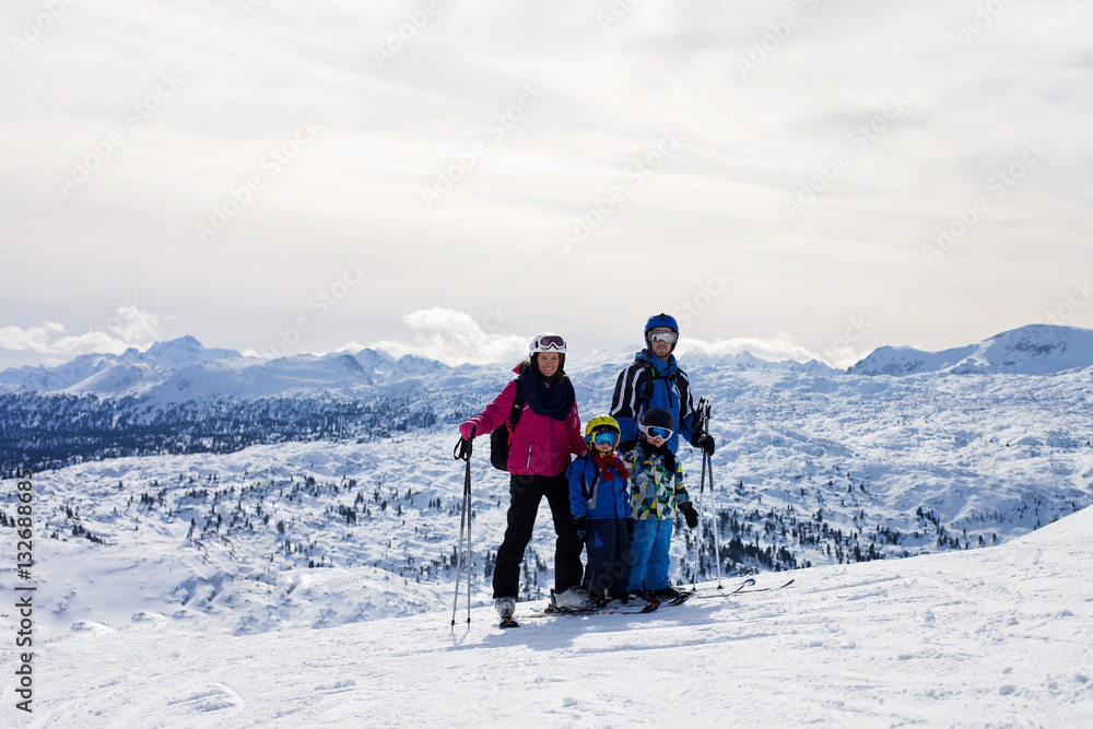 Young happy family with two childrens, boy brothers, skiing in A