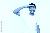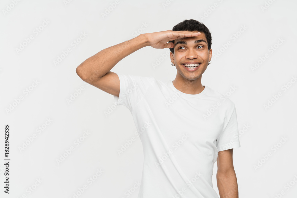 Young fun man of African American ethnicity 20s wear casual shirt hold hand at forehead look far away distance isolated on plain pastel light white background studio portrait. People lifestyle concept