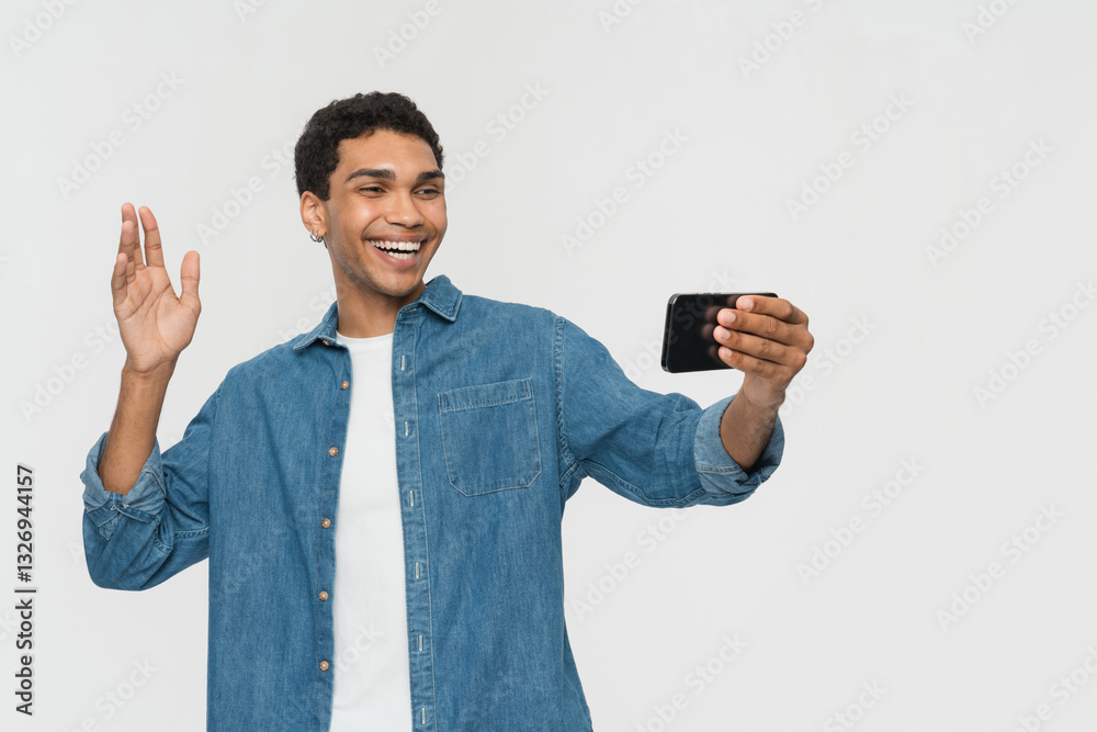 Young man of African American ethnicity 20s wear casual doing selfie shot on mobile cell phone post photo on social network isolated on plain white background studio. People lifestyle concept