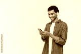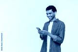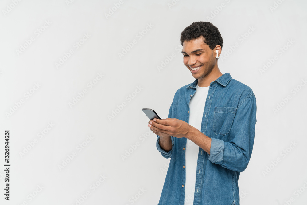 Young attractive african american dark skin man in casual looking at smartphone while texting, using mobile phone,online app isolated on white background copy space