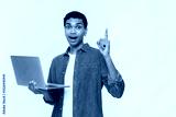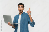 Happy excited african guy male student in casual clothes using holding laptop computer pc and pointing finger up standing isolated over white background. Technology concept