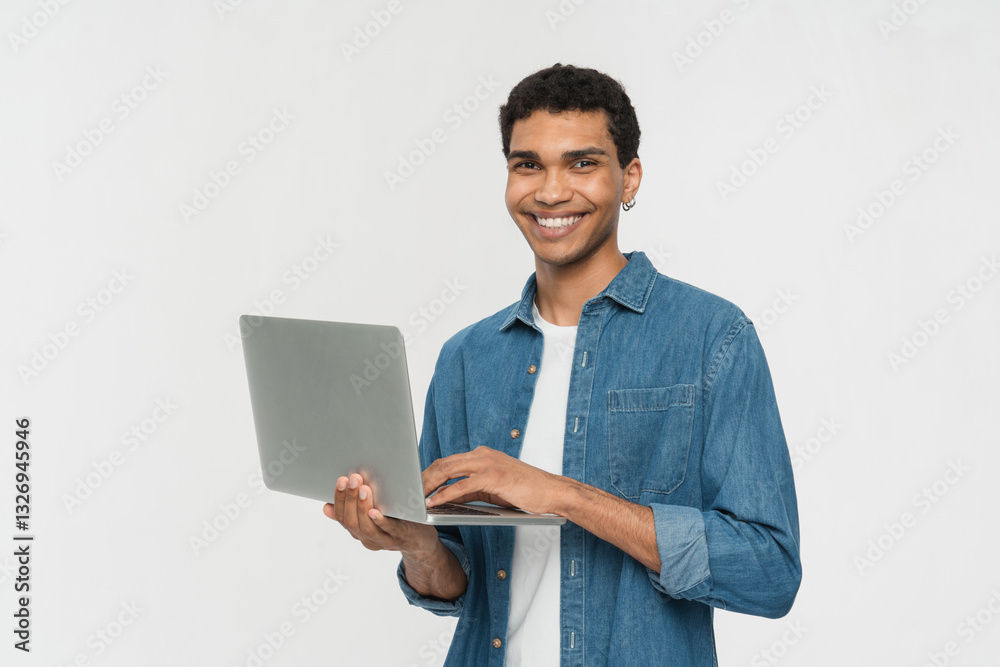 Optimistic african-american male student in casual jeans shirt using laptop pc isolated on white background, smiling multiracial freelancer man looking enjoying remote work, advertising concept