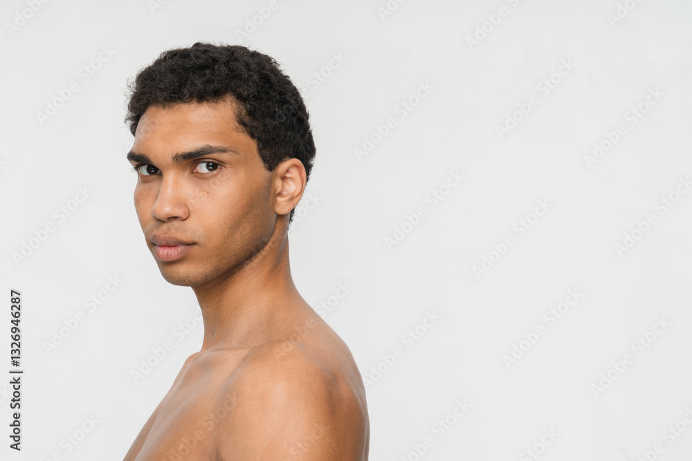 Cropped image of thoughtful black handsome guy looking at camera . Young brunette curly model man. Concept of modern male beauty. Isolated on white background. Studio shoot. Copy space