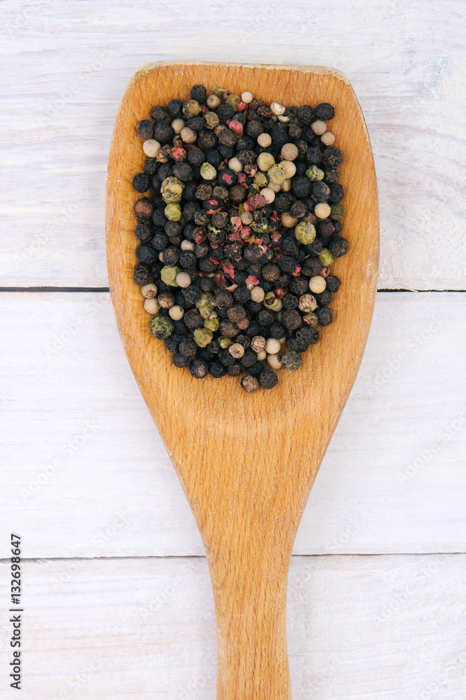 Assorted Dried spicy pepper in a wooden spoon on the table.