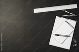 Black chalkboard office table or desk seen from above. Top view product photograph. Shool or university concept image with set of accessories
