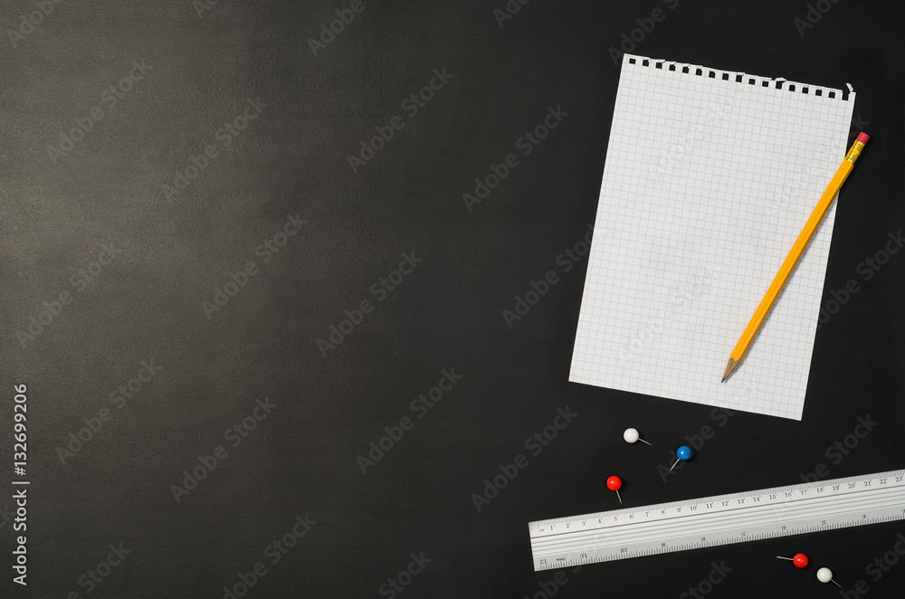 Black chalkboard office table or desk seen from above. Top view product photograph. Shool or university concept image with set of accessories