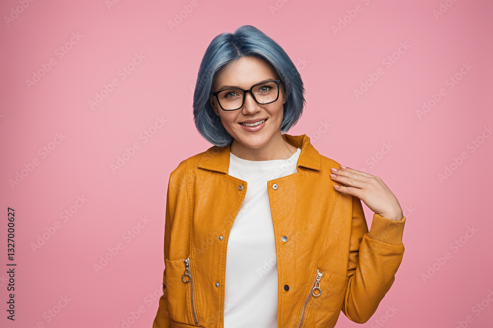 Portrait of a fashionable young woman with blue hair and glasses, showcasing confidence and a vibrant modern style, wearing a yellow jacket, smiling cheerfully against a bright pink background.