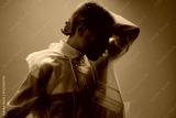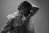 Portrait of a person standing against an orange backdrop, illuminated by dynamic colorful lighting, evoking creativity and modern art aesthetics with contemporary fashion style.
