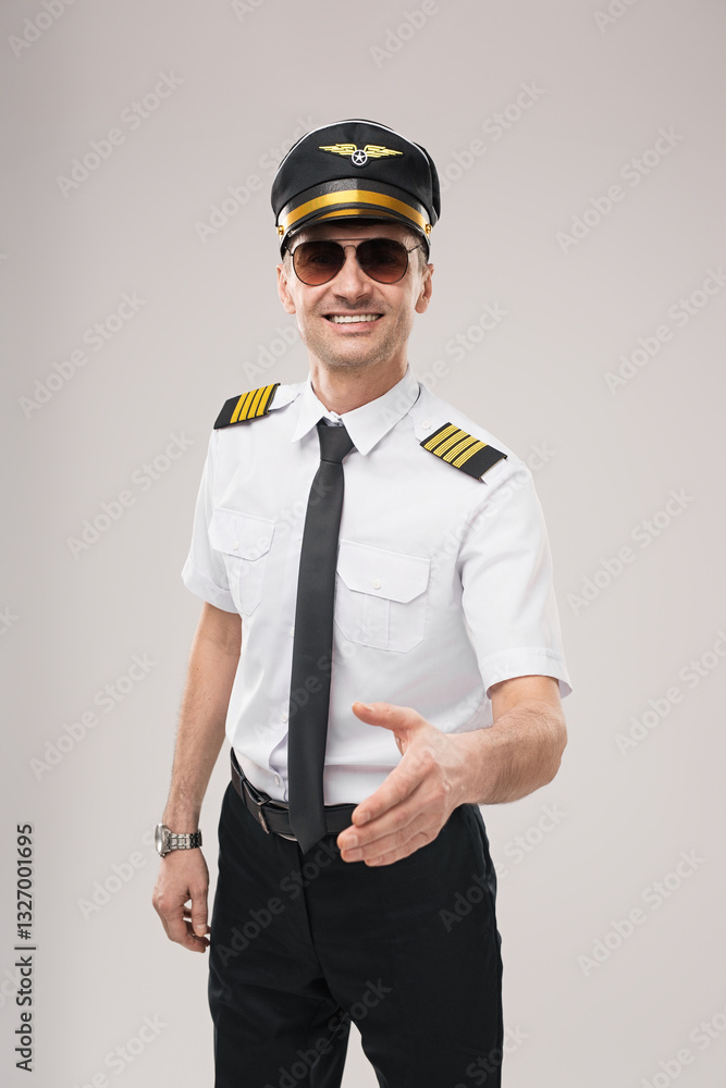 Professional airline pilot dressed in a full uniform extending a friendly handshake. Ideal for concepts related to aviation, hospitality, transport, and customer service.