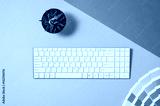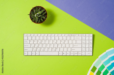 Computer workspace with keyboard on colorful office table or desk seen from above. Top view product photograph. Concept image with blank copy space