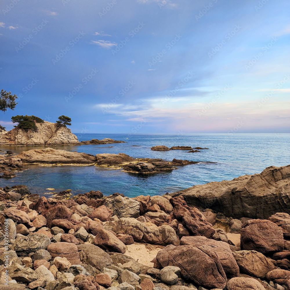 Evening seascape with calm water surface and cliffs. Turquoise water and big stones on the Mediterranean coast.