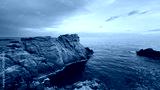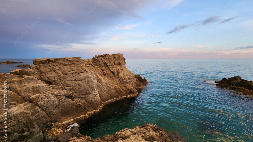 Seascape with calm water surface and rocks. Turquoise transparent water. Evening on the Mediterranean coast.