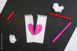School supplies border on black chalkboard background. Top view product photograph with copy space for text or design. Back to school, education concept