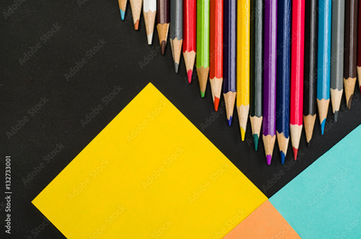 School supplies border on black chalkboard background. Top view product photograph with copy space for text or design. Back to school, education concept