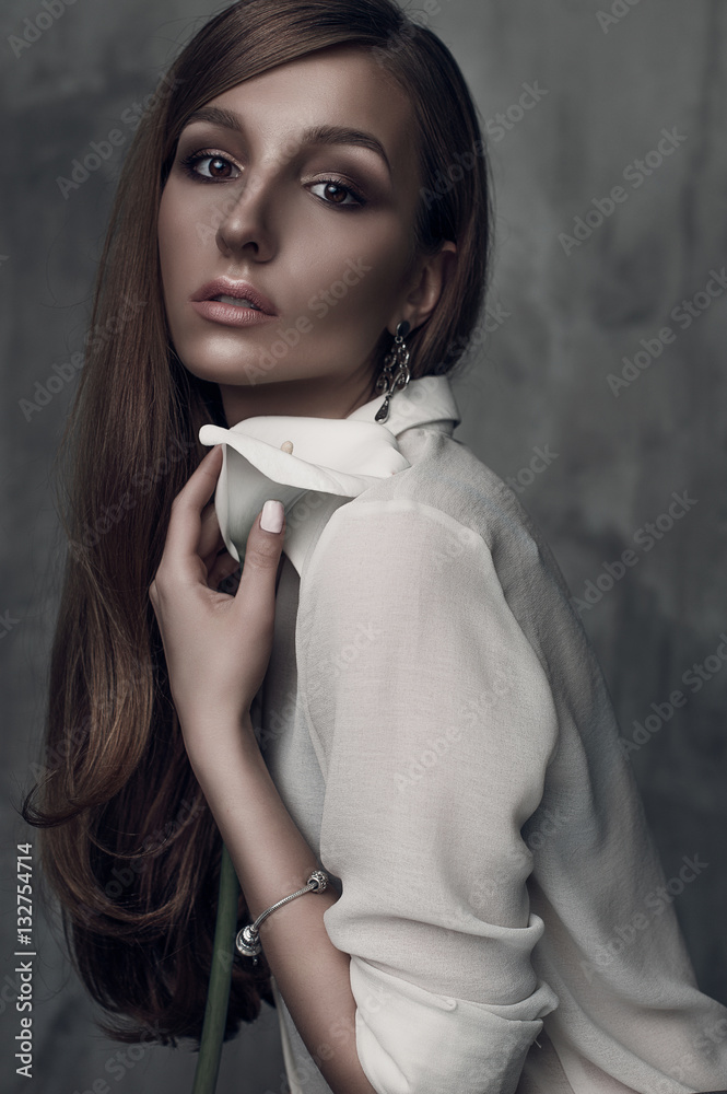 Fashion photo of young magnificent woman. Girl posing. Studio photo
