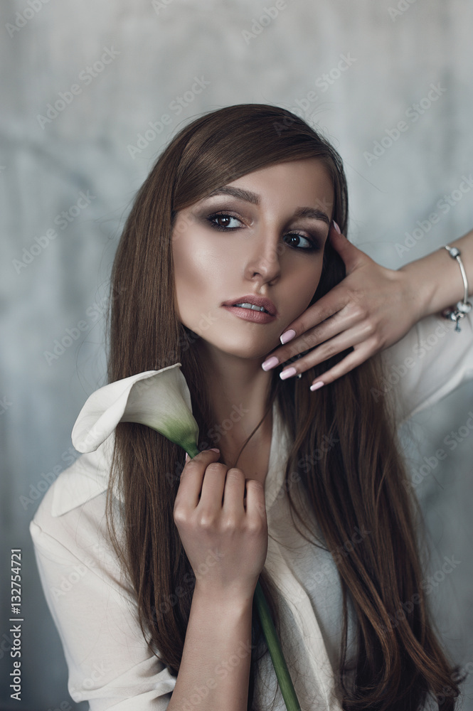 Fashion photo of young magnificent woman. Girl posing. Studio photo