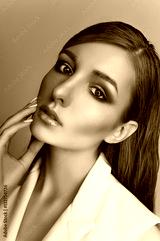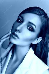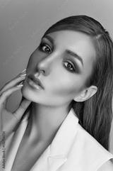 Portrait of a beautiful woman with creative make-up coral lips in white jacket smooth and wet hair