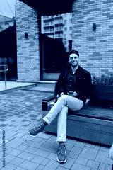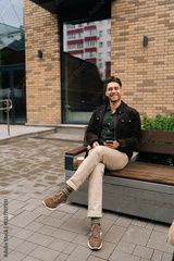 Full length vertical portrait of cheerful young man sitting on bench with takeaway coffee and using smartphone smiling looking at camera on city street. Bearded male reading message on cellphone