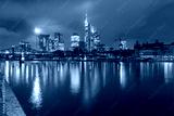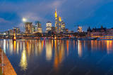 Picturesque view of Frankfurt am Main skyline and Eiserner Steg bridge with mirror reflections in the river during morning blue hour, Germany