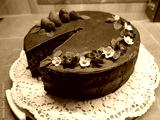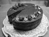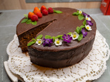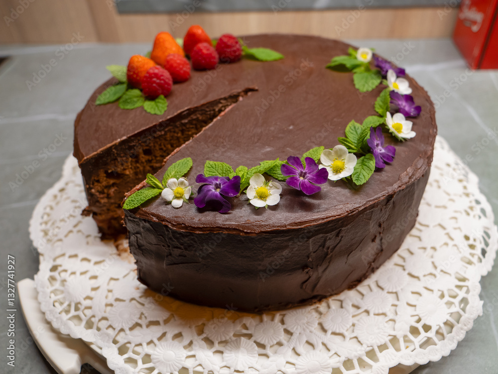 CLOSE UP: Beautifully crafted chocolate cake covered in glossy ganache, adorned with raspberries, strawberries, mint leaves and edible flowers. Single slice is cut, revealing the rich, moist interior.