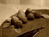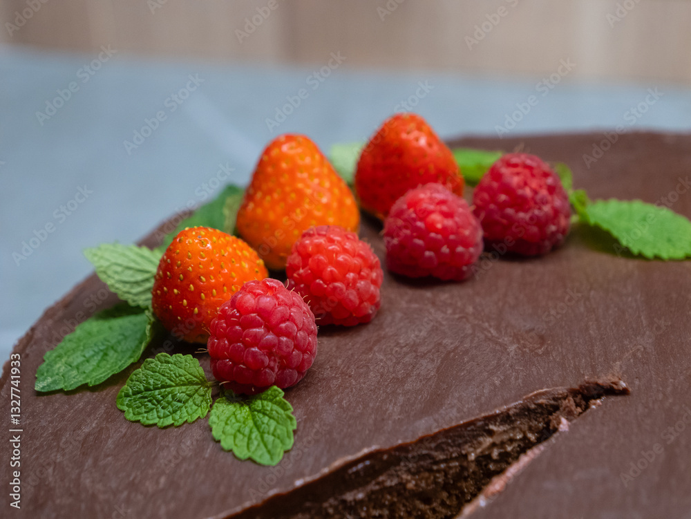 CLOSE UP: Chocolate cake with fresh raspberry and strawberry garnish. Red berries rest on a bed of vibrant mint leaves, adding a natural touch to the rich, dark chocolate icing of homemade pastry.