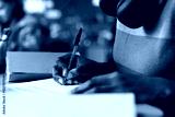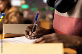 Black university scholar completing a detailed course project using educational resources and materials from the college library general database. Girl working hard on her academic notes. Close up.