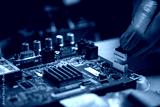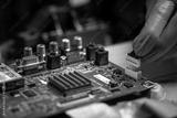 Repairman fixing an LCD TV circuit board on table. Close up, electronic device