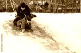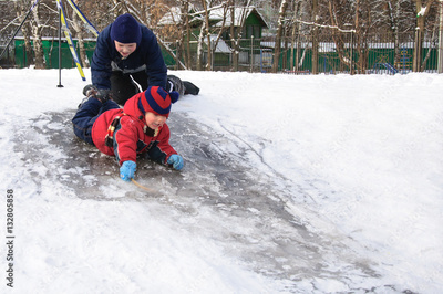 Happy children sliding from a little snowy hill.