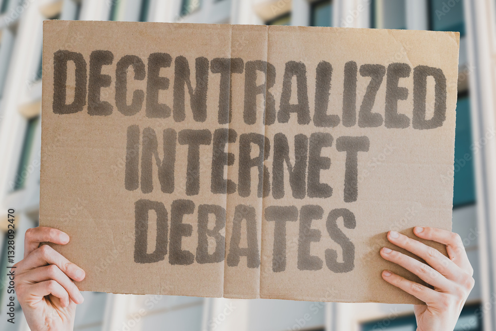 "Decentralized internet debates" on worn cardboard. Highlights discussions about a distributed web. BLOCKCHAIN. WEB3. GOVERNANCE. AUTONOMY. SECURITY. DATA. NETWORKS