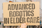 "Advanced robotics in elder care" on worn cardboard. Highlights robotics helping aging populations. ASSISTANCE. AUTOMATION. COMPANIONSHIP. MOBILITY. SUPPORT. WELLBEING. INNOVATION