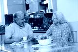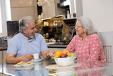 Happy retired senior indian couple enjoy morning eat or coffee together at home while discussing, Mature asian husband wife having breakfast, Love and bonding. Retirement life.