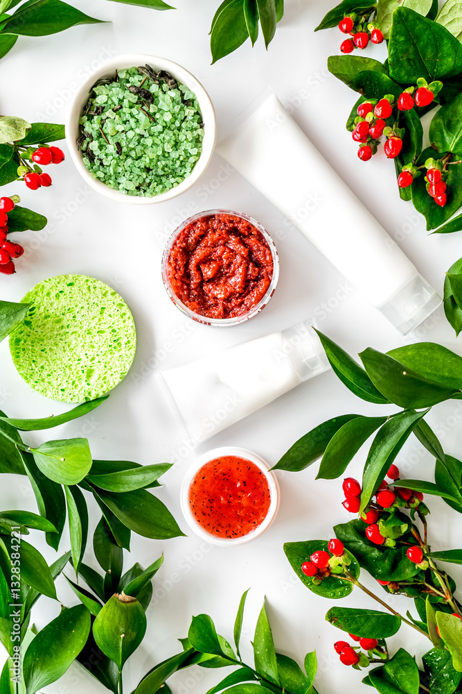 Cosmetics for face with salt, lotion, cream from herbs on white background top view
