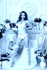 Beautiful young sexy woman , wearing white lingerie, room decorated with flowers. Perfect makeup. Beauty fashion. Eyelashes. Studio retouched shot.
