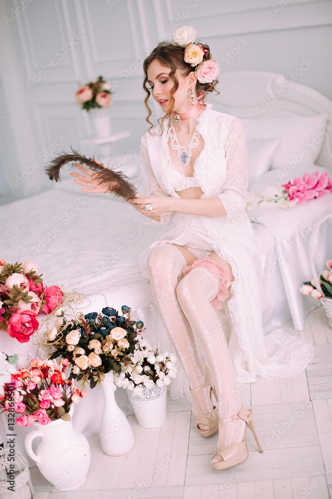Beautiful young sexy woman sitting on white bed, wearing white lace dress, hair decorated with flowers. Perfect makeup. Beauty fashion. Eyelashes. Studio retouched shot.