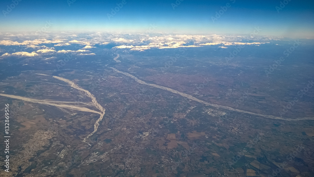 Aerial view of Alps Austria and Italy, Europe. Snow covered tops of the mountains, mountain lakes, villages. Alpine meadows, landscape.