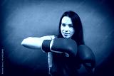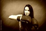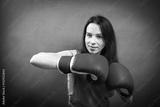 Boxer woman during boxing exercise making direct hit