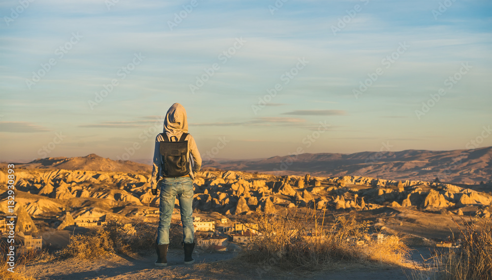 Young woman traveller wearing hoodie, backpack and jeans watching sunrise in the mountains over Goreme, Cappadocia, Central Turkey
