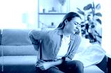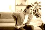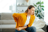 Back pain concept.Upset caucasian woman in casual clothes sitting on a couch at home with eyes closed, holding her lower back with a pained expression, she suffering from back pain or spine discomfort
