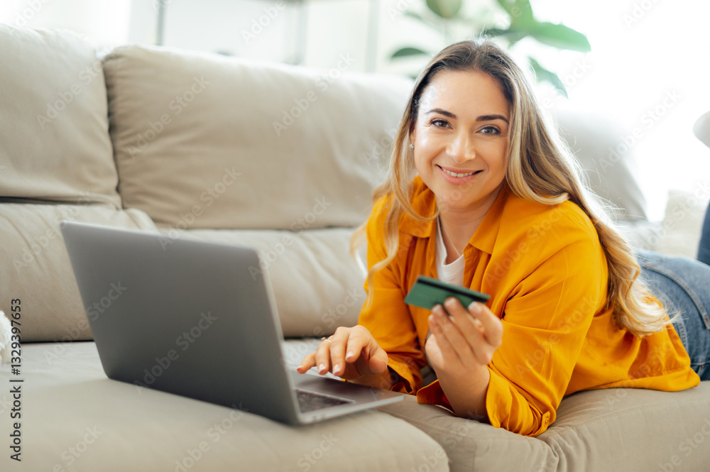 Online shopping, e-banking. Smiling woman in a yellow shirt lying on a sofa at home, holding a credit card while browsing on a laptop, she doing shopping online in a relaxed home environment