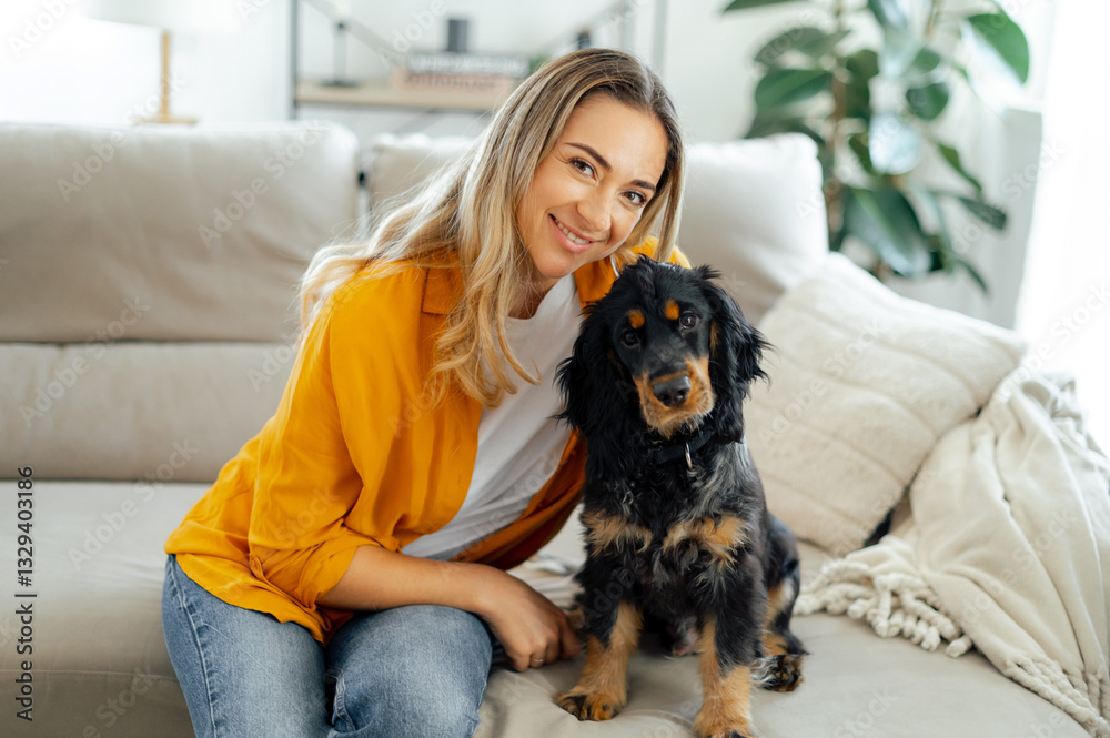 Portrait a dog with his owner. Happy pretty caucasian woman in casual clothes, sits on a couch at cozy living room, hugging her black and tan dog with a loving expression, smiles at camera