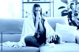 Upset unhealthy caucasian woman in a yellow shirt sits wrapped in a soft white blanket on a couch in living room, blowing her nose into a tissue, she looks unwell, showing symptoms of a cold or flu