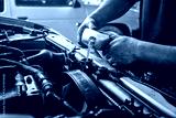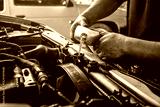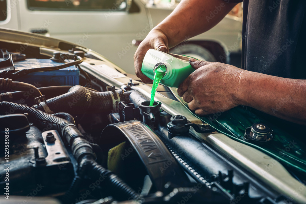 Male professional mechanic pouring antifreeze coolant liquid into car engine radiator in service center, car repair shop. Concept of car radiator coolant maintenance