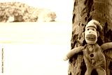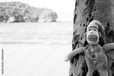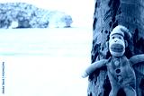 The blue monkey doll on the beach.